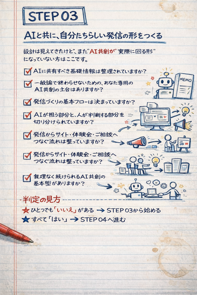 発信とAI活用を、“現実に続く運用”へ変えていくための接続工程 です。